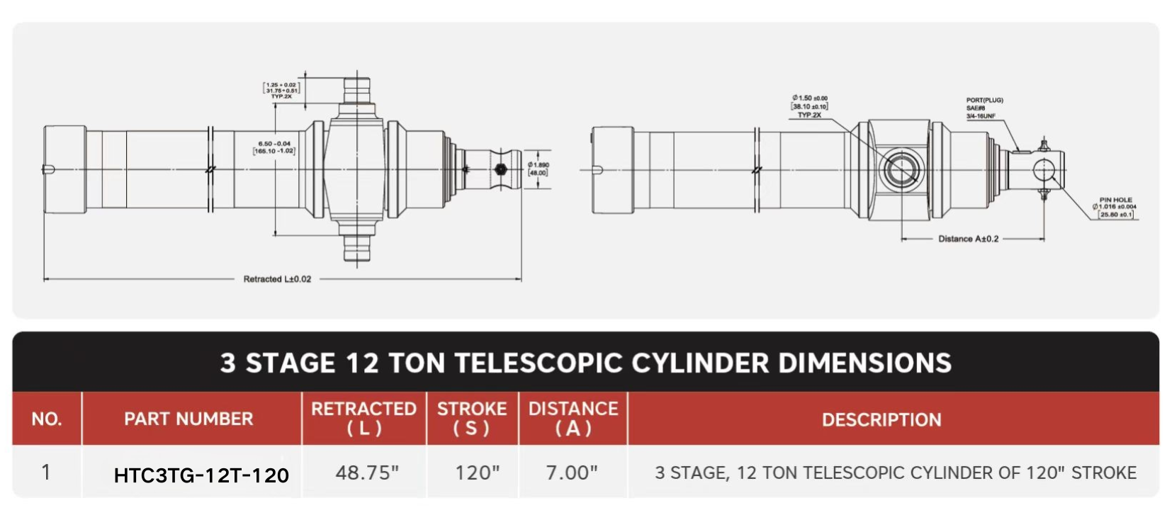 "HTC3TG-12T-120", 3 fokozatú, 12 tonna 120 hüvelykes löketű teleszkópos hengerek