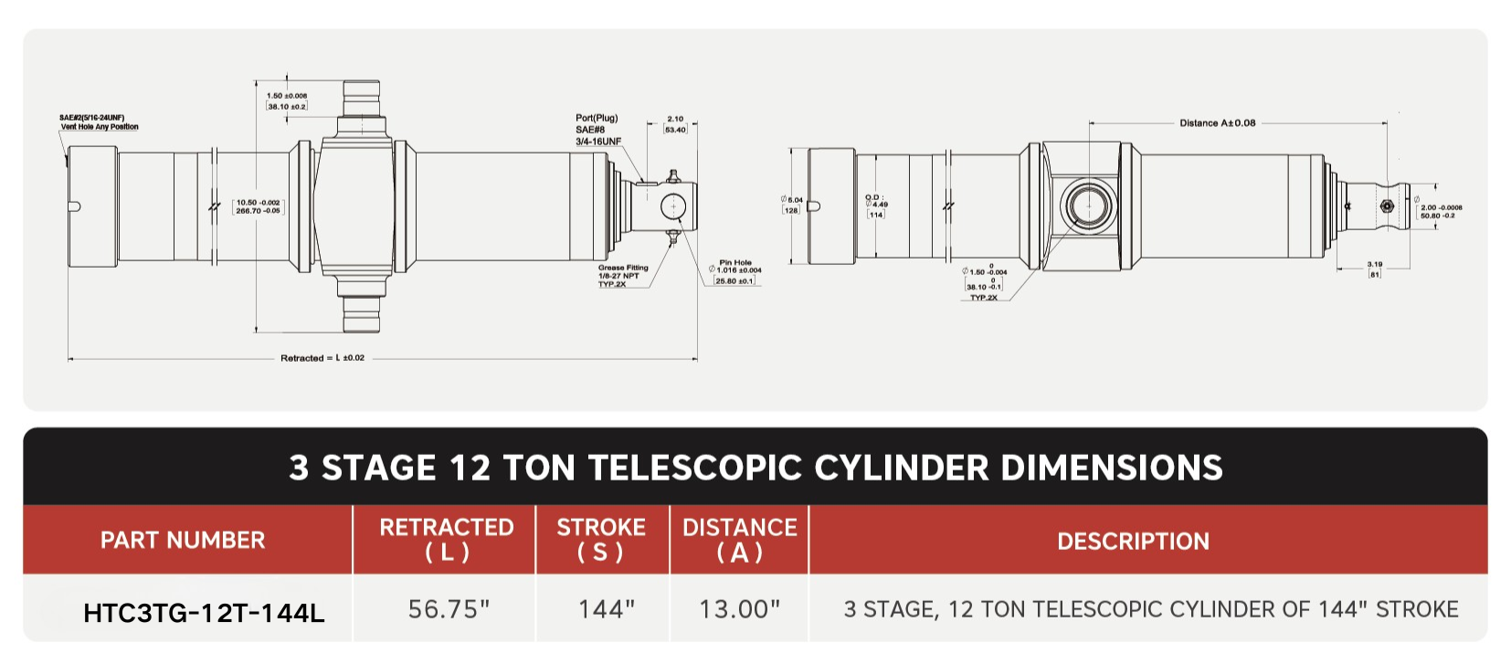 "HTC3TG-12T-144L", 3 fokozatú, 12 tonna 144" löketű, 13" tengelytávú teleszkópos hengerek