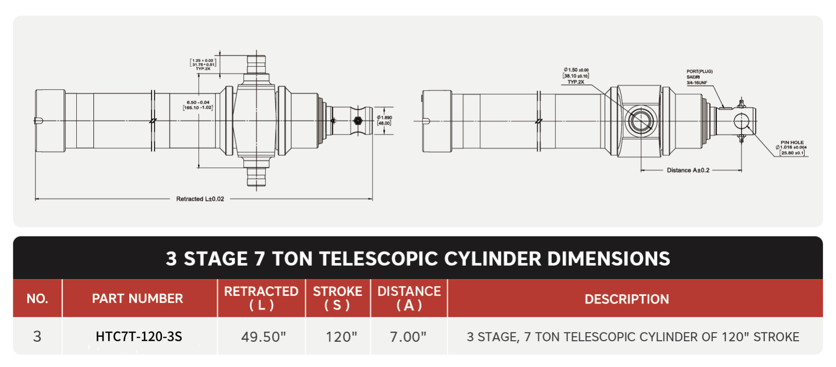 "HTC3TG-7T-120", 3 fokozatú, 7 tonna 120 hüvelykes löketű teleszkópos henger